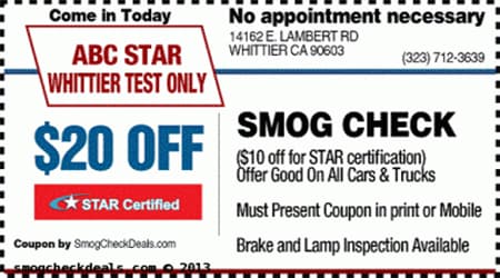 - Smog Coupons: We sweeten the deal with special Whittier Smog Check Coupons to lower your costs even more. Call us today to set up an appointment, or come right in for walk in service. Either way, we will honor our coupons and get you on your way in 15 minutes or less!